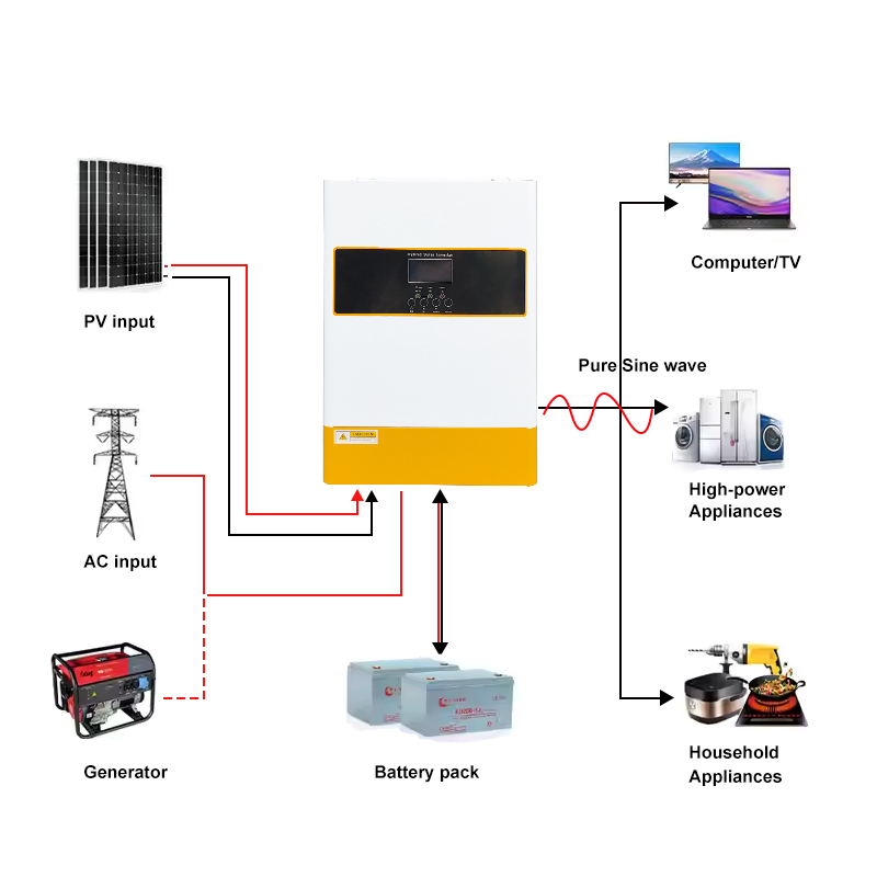 | Tipo de inversor | Inversor solar híbrido | Tipo de saída | Onda sine sine única, pura |